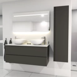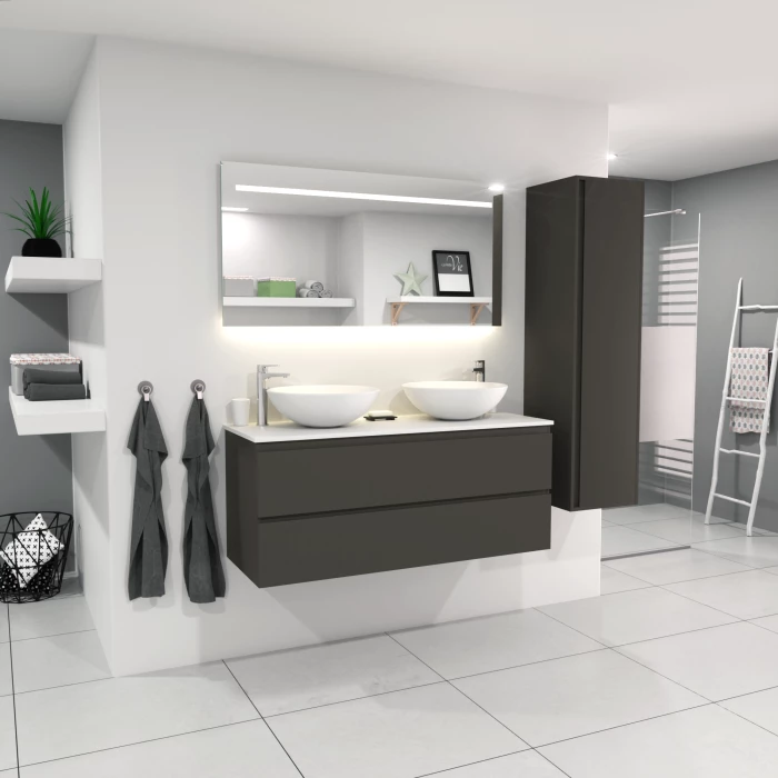Het badkamermeubel Sally is verkrijgbaar in meerdere kleuren. De onderkast is uitgevoerd met 4 lades die beschikken over een softclose sluiting. De lades zijn greeploos afgewerkt, zodat het geheel rustig en modern oogt.