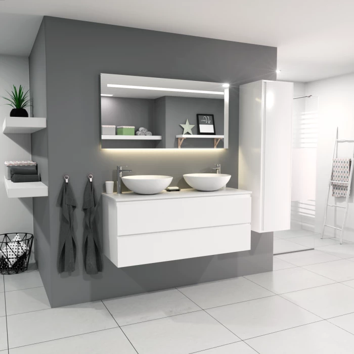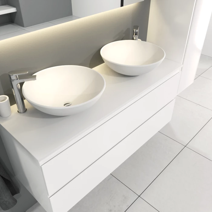 Boven op de onderkast komt een plaat te liggen die gemaakt is van solid surface. Dit materiaal is mat wit van kleur. Daarop worden de waskommen geplaatst. Deze zijn uiteraard gemaakt van hetzelfde materiaal en komen netjes overeen qua kleur. In het blad zijn nog geen gaten gecreëerd. Je kan er zelf voor kiezen om kraangaten te boren in het topblad. Zo kan je kiezen of je voor een staande of een inbouw wastafelkraan gaat. Ook zitten er nog geen afvoergaten in het blad, zodat je zelf kan bepalen waar de waskommen komen. Leuk hé?