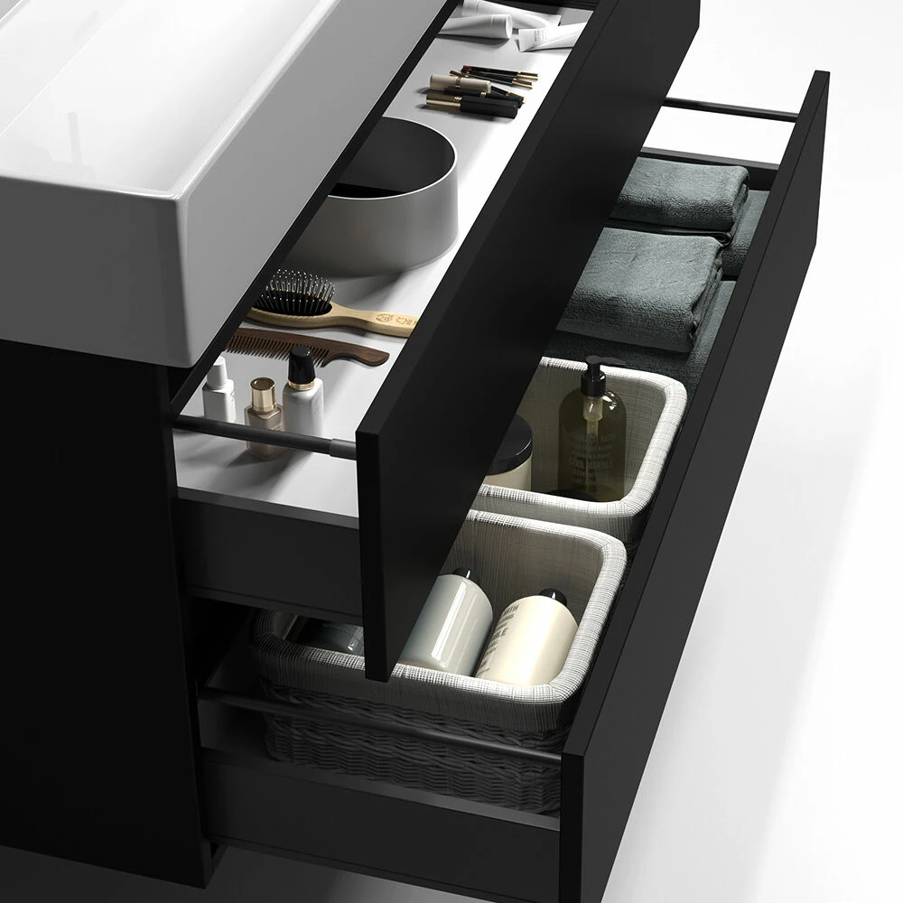 Houten badkamermeubels geven net dat beetje extra warmte in de badkamer. Top aan een houten meubel is dat het tijdloos is. Het onderkastje heeft een strak design, is greeploos en heeft softclose lades. Ook zit er een sifonuitsparing in, zodat je niet hoeft te stoeien met de ruimte die je sifon inneemt. De wastafel die je erbij krijgt past per-fect op de wastafelonderkast.