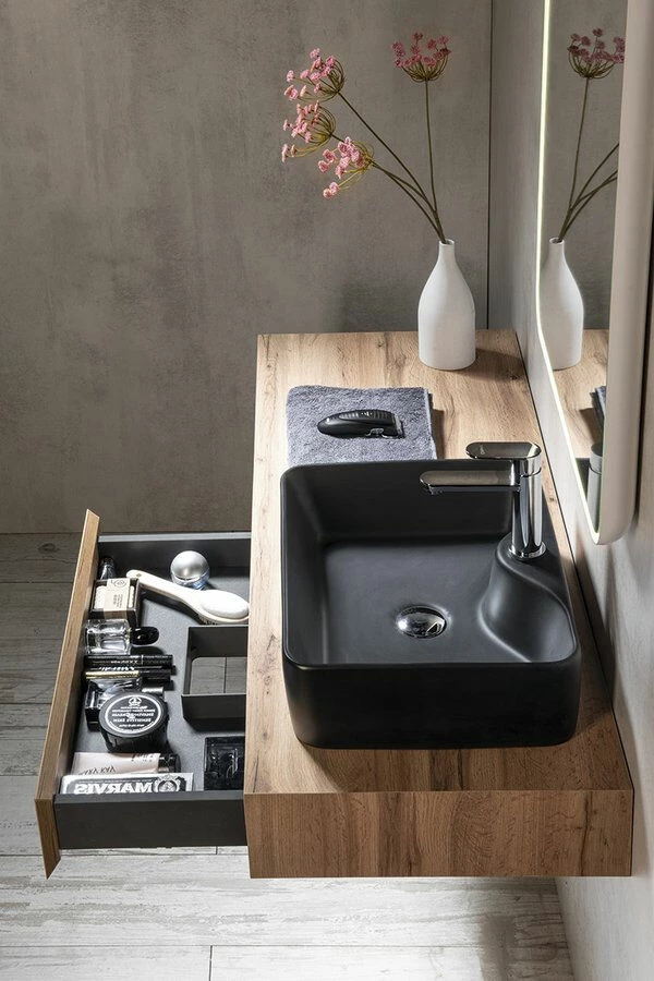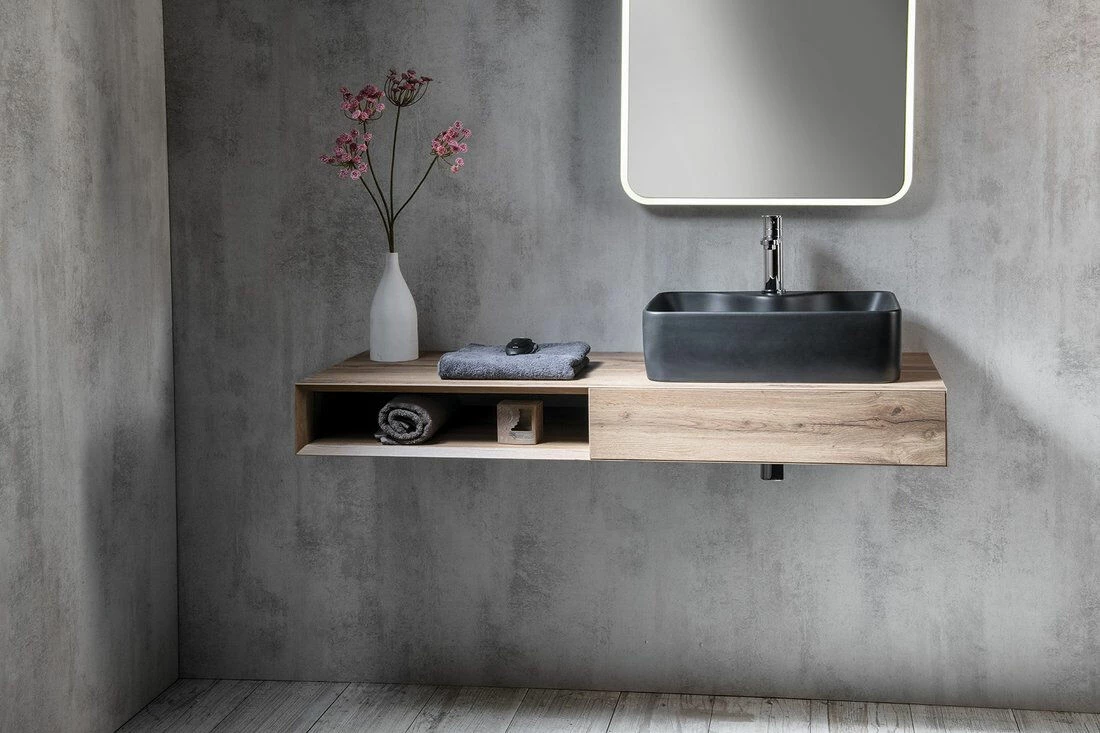 Ben je op zoek naar een badkamermeubel dat niet zo groot is, maar waar je wel nog spullen in kan opbergen? Dit meubel van Sapho lijkt op een wastafelblad maar heeft nog wel opbergruimte. In het meubel zit aan de rechterkant een lade met sifonuitsparing. Aan de linkerkant van het meubel zit een open stuk waar je ook nog badkamerspullen kwijt kan zoals handdoeken. De lade van het meubel is greeploos en kan worden geopend aan de zijkant.