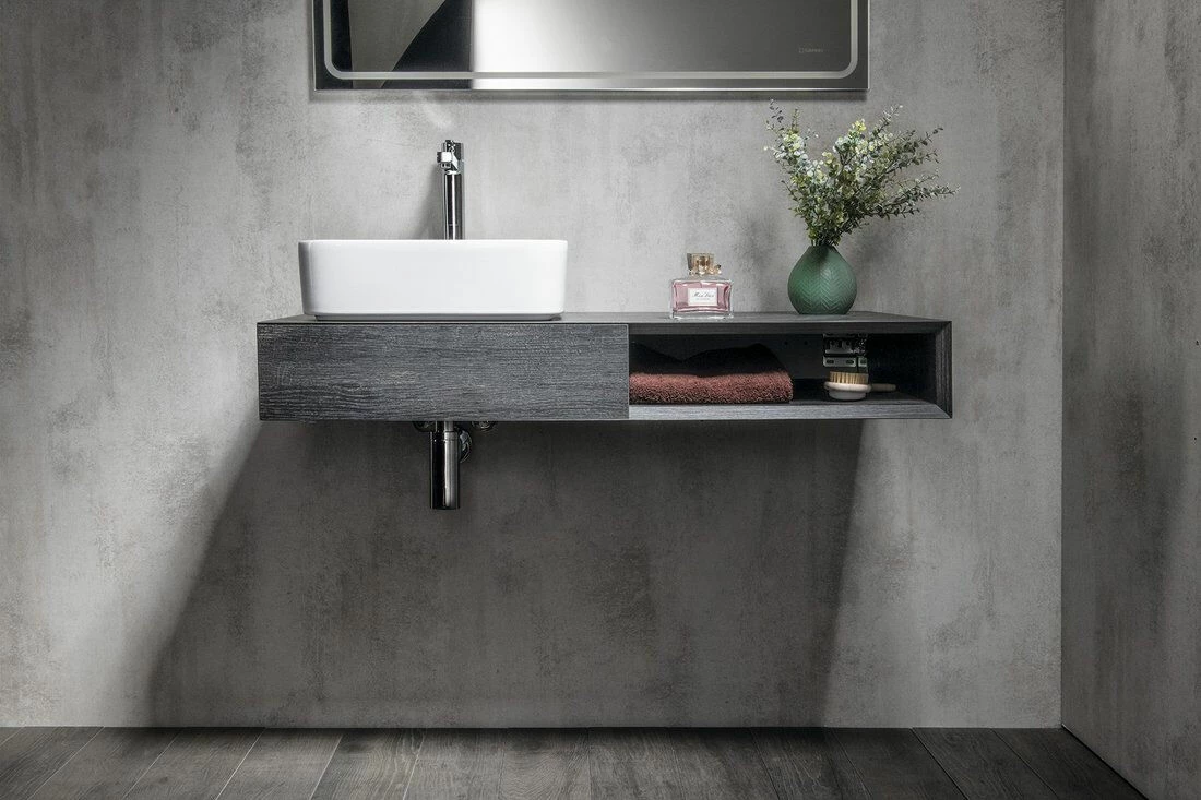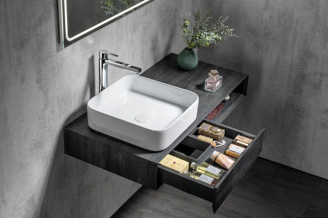 Ben je op zoek naar een badkamermeubel dat niet zo groot is, maar waar je wel nog spullen in kan opbergen? Dit meubel van Sapho lijkt op een wastafelblad maar heeft nog wel opbergruimte. In het meubel zit aan de linkerkant een lade met sifonuitsparing. Aan de rechterkant van het meubel zit een open stuk waar je ook nog badkamerspullen kwijt kan zoals handdoeken. De lade van het meubel is greeploos en kan worden geopend aan de zijkant.