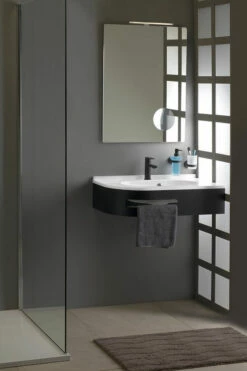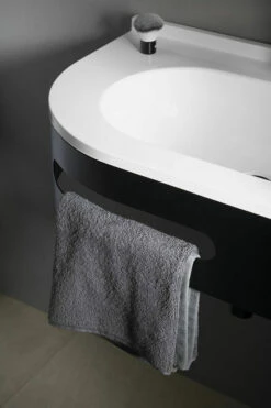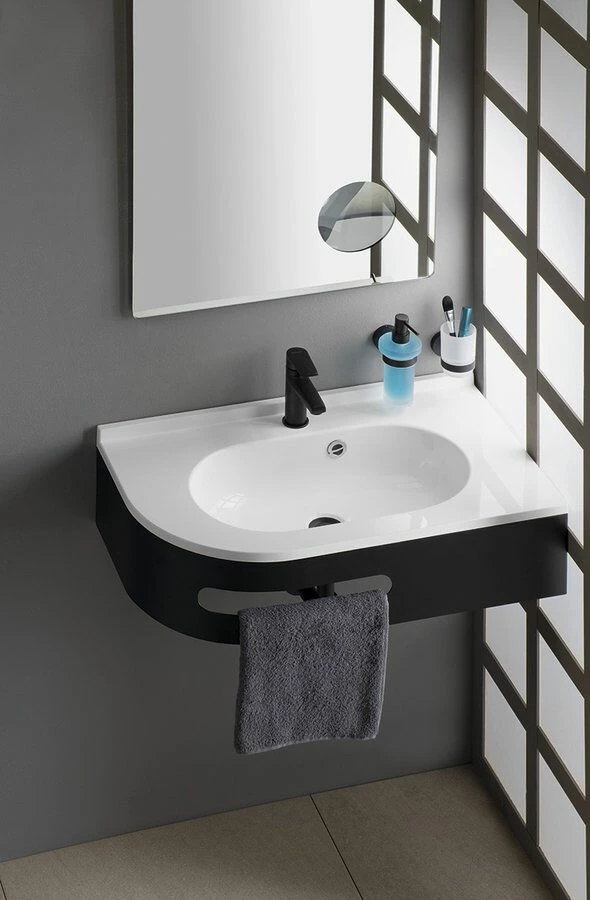 Het console is 74,5cm breed, 44,5cm diep en heeft een hoogte van 17cm. Totale hoogte inclusief wastafel is 21,4cm. Aan de voorzijde is een uitsparing voor een handdoek gecreëerd. Het is gemaakt van metaal en afgewerkt in de kleur mat zwart.
