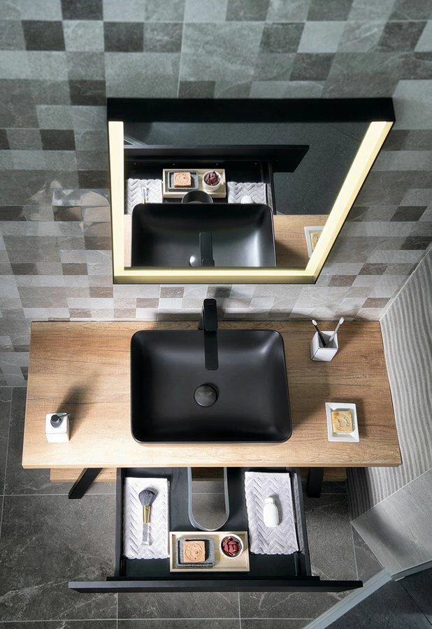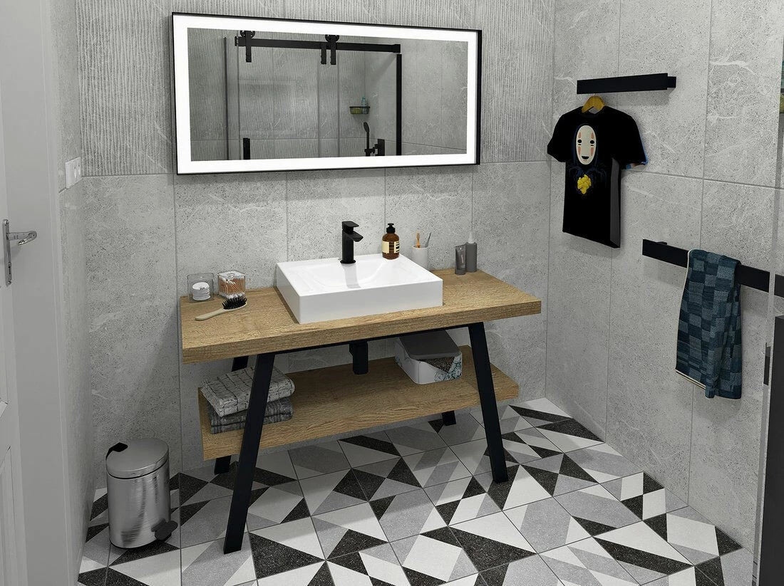 Het tijdloze en luchtige ontwerp is goed te plaatsen in industriële en moderne badkamers. De basis van het badmeubel is een mat zwarte stalen frame. Hierin worden 2 planken verwerkt die gemaakt van mdf. Het mdf is gelamineerd en daardoor waterdicht en krasbestendig. De platen zijn 48mm dik. De tafels met afmetingen van 110 tot 130cm kunnen worden aangevuld met een mat zwarte lade. Deze is terug te vinden in de toebehoren.